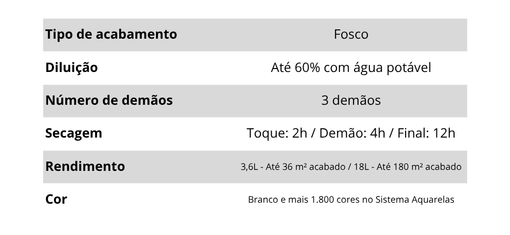 Indicada para proteção e decoração de superfícies externas e internas de reboco, concreto, gesso, massa acrílica, massa corrida, texturas e fibrocimento. Possui excelente cobertura e rendimento, de fácil aplicação, secagem rápida, resistência ao intemperismo e fungos (mofo).